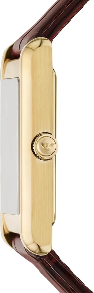 Armani Spring collection men's quartz / 2-hand watch. Watch with stainless steel case with mixed gold color finish and rectangular shape. Case size: 25 MM. Thickness: 5 MM. The glass is transparent. The dial is white. Lug distance: 16 MM. The strap is leather with a polished finish. The color is brown with a pin buckle. Water resistance of 5 ATM. The reference is AR11665