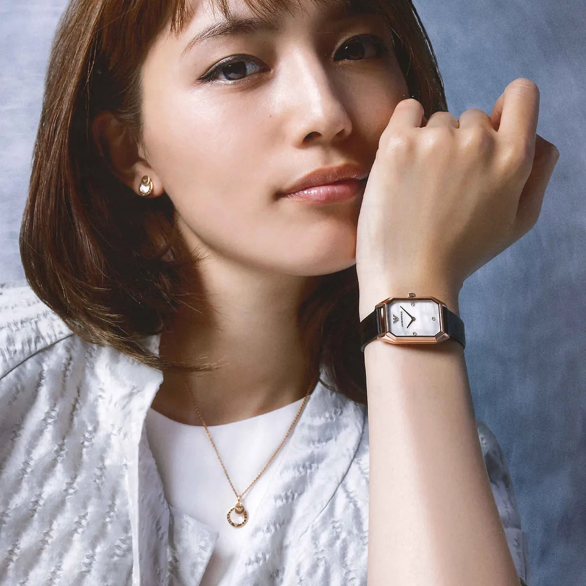 Emporio Armani watch featuring 24x35mm case with two-hand movement Mother-of-pearl dial with rose gold-tone hands and black leather strap