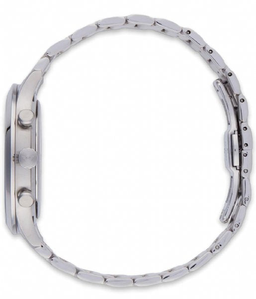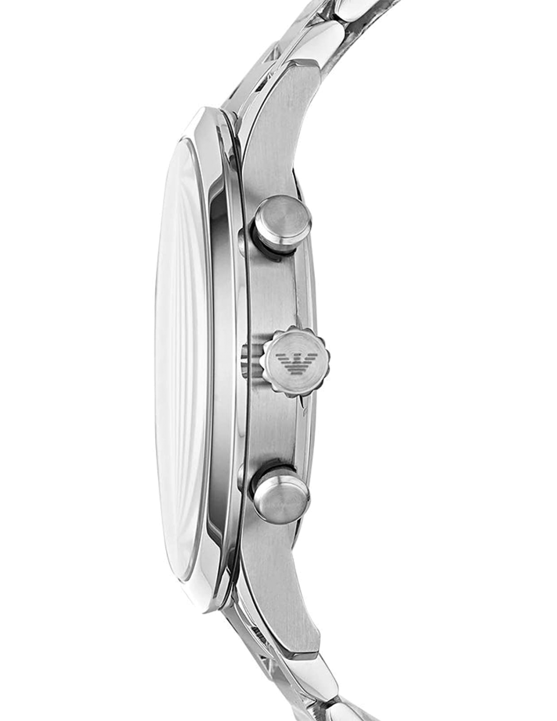 Benefiting from a chronograph function, the Emporio Armani Giovanni AR11208 doubles as a stopwatch and has the classic three subdials embedded in the dial characteristic of a chronograph watch. The polished stainless steel bracelet strap and case are complemented by a black brushed face and a combination of baton and Roman numeral hour markers. The watch is finished with the sleek Emporio Armani logo at 12 o’clock.