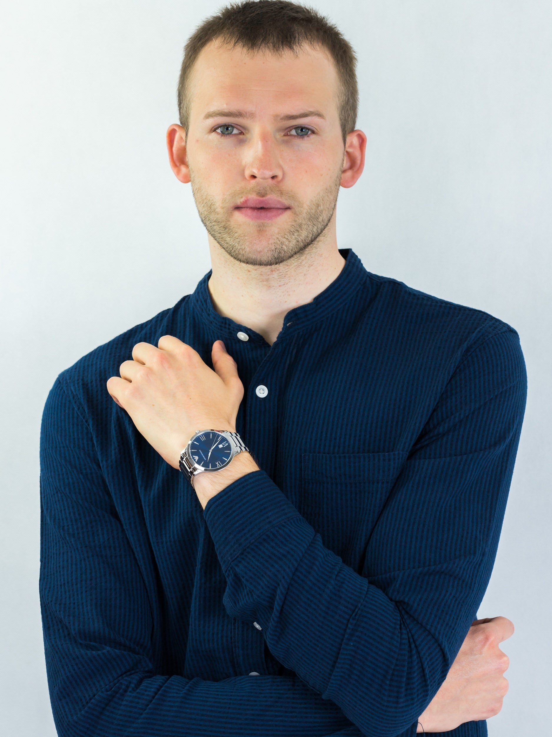 The gorgeous deep-blue dial contrasts with the elegant silver hour markers, which feature Roman numerals and the iconic Armani logo at 12 o’clock. There’s a discreet date window at 6 o’clock, and a polished stainless steel bracelet with butterfly clasp to complete the look. The Gents Giovanni Emporio Armani Watch is a stylish fashion accessory that can be paired with any outfit, whether you’re at work or at play.