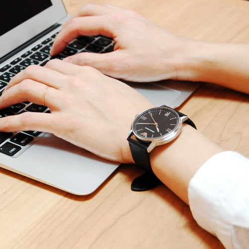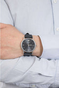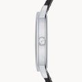 Sleek and refined, this men's Emporio Armani watch gleams with a black sunray dial, stainless-steel case, and matte black leather strap.