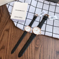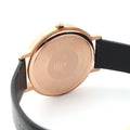 Rose gold-tone stainless steel case with a black leather strap. Fixed rose gold-tone bezel. Silver dial with rose gold-tone hands and index hour markers. Dial Type: Analog. Quartz movement. Scratch resistant mineral crystal. Pull / push crown.