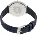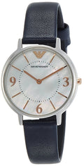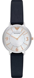 Emporio Armani Women's Watch. This Model Has 32m Dimension Case And Made Of Stainless Steel With Mixed Silver Finish / Steel And Round Shape Finish. The Case Has 6m Thickness, The Glass Is Transparent, The Dial Color Is Mother Of Pearl, White And The Stainless Steel Stainless Steel With Silver And Stainless Steel Shiny And Satin Finish. The Distance Of The Bent Of This Clock Is Of 14 Mm. The Strap Is Skin And Is Blue Color. Water Resistance Is At 3 Atm. Clock Type And Movement: Quartz / 2 Hands. The Reference Is Ar2509