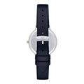Stainless steel case with a blue leather strap. Fixed stainless steel bezel. White mother of pearl dial with rose gold-tone hands and index hour markers. Arabic numerals mark the 3, 6, and 9 o'clock positions. Minute markers around an inner ring. The Emporio Armani Eagle appears at the 12 o'clock positiuon. Dial Type: Analog. Quartz movement. Scratch resistant mineral crystal. Pull / push crown. Solid case back. Round case shape. Case size: 32 mm. Case thickness: 6 mm. Band width: 14 mm. Tang clasp. Water resistant at 30 meters / 100 feet. Functions: hour, minute. Casual watch style. Emporio Armani Kappa Quartz White Dial Ladies Watch AR2509.