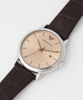 It features a brown textured leather strap, a polished stainless steel case and has a light brown with three hand movement and date window dial. The AR11096 comes with an official Emporio Armani Watches 2 year guarantee.