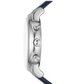 Emporio Armani's 46mm watch features a sunray blue dial, chronograph movement and blue leather strap.