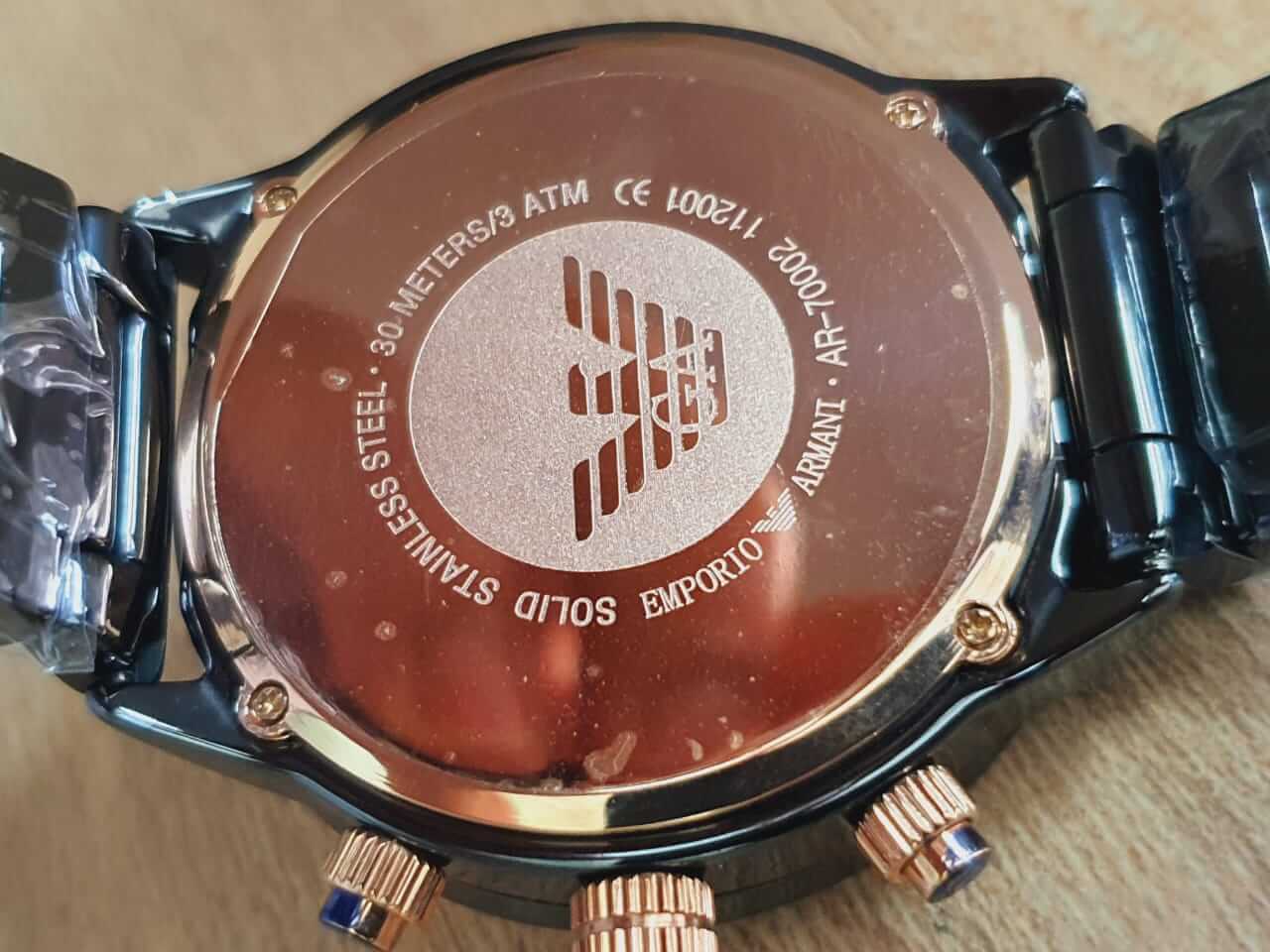 Chronograph - three sub-dials displaying: 60 second, 30 minute and 24 hour. Quartz movement. Scratch resistant mineral crystal. Solid case back. Round case shape. Case size: 43 mm. Cse thickness: 11 mm. Band width: 22 mm. Fold over clasp with a push button release. Water resistant at 50 meters / 165 feet. Functions: chronograph, tachymeter, date, hour, minute, second. Casual watch style. Emporio Armani Chronograph Quartz Black Dial Men's Watch AR70002.