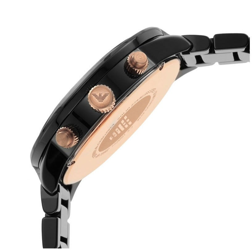 Black ceramic case with a black ceramic bracelet. Fixed black ceramic bezel showing tachymeter markings. Black dial with luminous rose gold-tone hands and index hour markers. Minute markers around the outer rim. The Emporio Eagle logo appears at the 12 o'clock position. Luminescent hands and markers. Date display between the 4 and 5 o'clock positions.