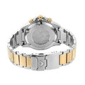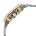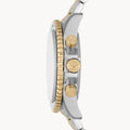 The watch is secured using a two-tone gold and silver stainless steel bracelet.