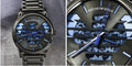 This 43mm watch features a gunmetal sunray dial with a blue eagle skeleton cutout and tonal indexes, three-hand movement and gunmetal stainless steel bracelet.