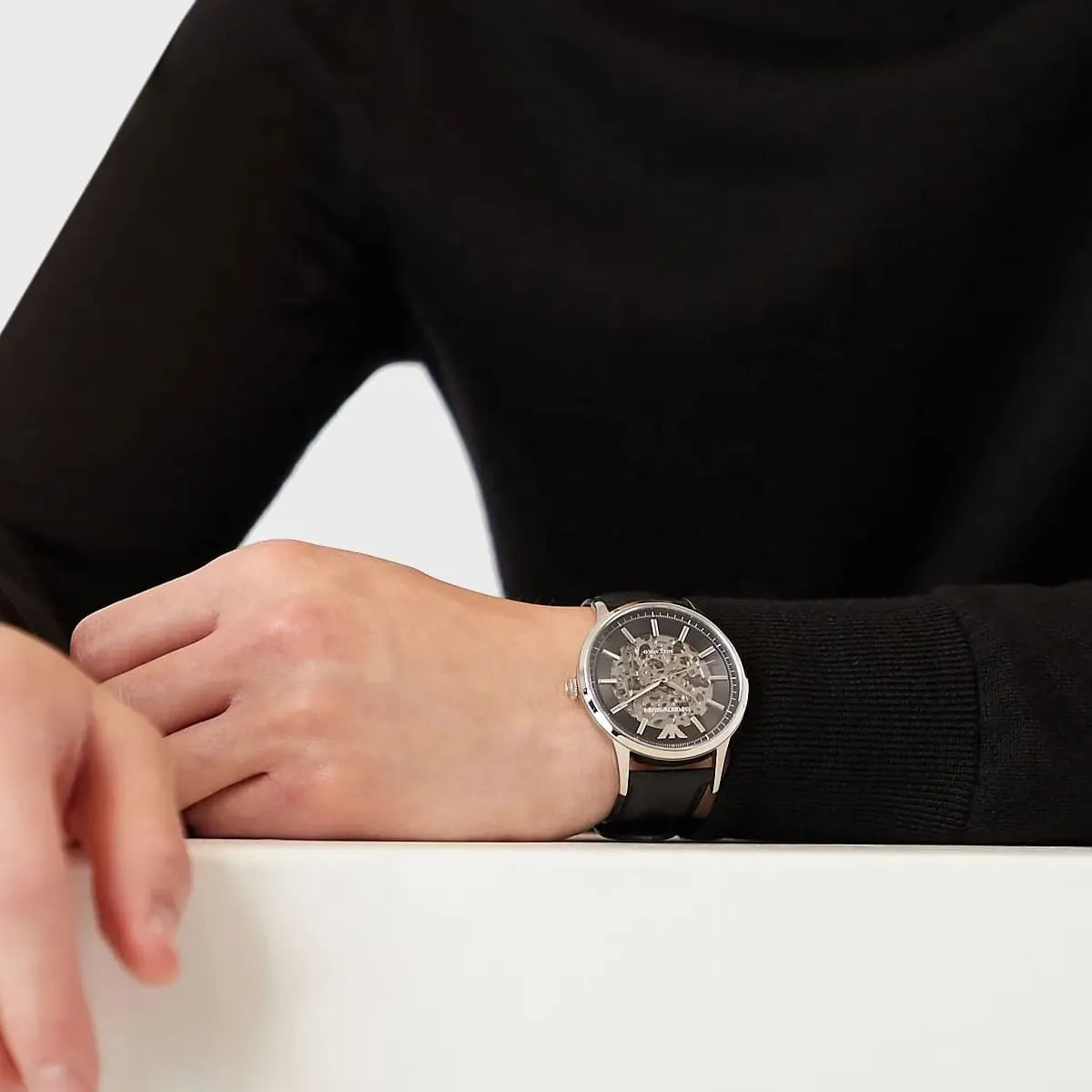 Emporio Armani Meccanico Skeleton Automatic Black Dial Black Leather Strap Watch for Men - AR60038Emporio Armani Meccanico Skeleton Automatic Black Dial Black Leather Strap Watch for Men - AR60038