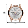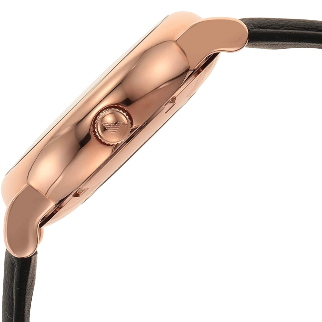Silver (Emporio Armani Eagle Cut-out) dial enhanced by rose gold-tone hands. Rose Gold-tone stainless steel case with a black leather band. Automatic movement. 50 meters / 165 feet water resistance. Fixed bezel. Scratch Resistant Mineral crystal. Transparent caseback. Tang clasp. Pull / Push crown. Case size 43 mm. Band 22 mm x long. Emporio Armani AR60031 Luigi Watch.