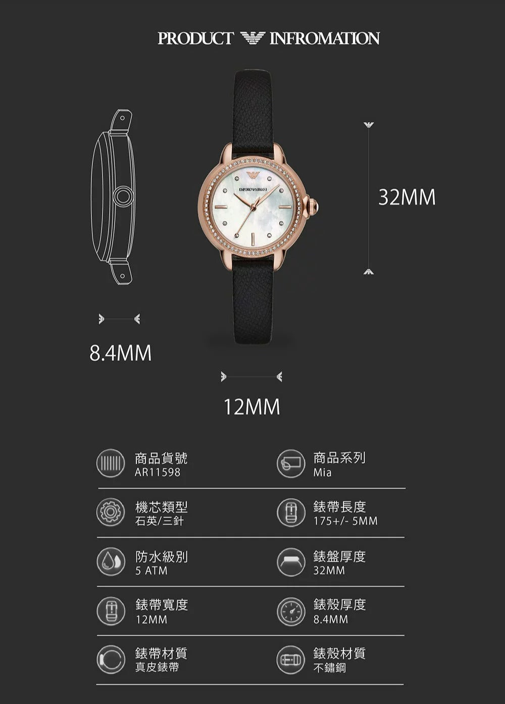 Emporio Armani Mia Mother of Pearl Dial Black Leather Strap Watch for Women - AR11598Emporio Armani Mia Mother of Pearl Dial Black Leather Strap Watch for Women - AR11598