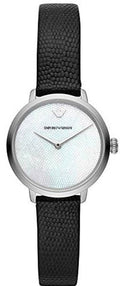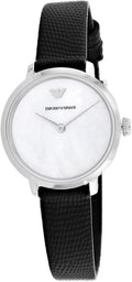 Stainless steel case with a black leather strap. Fixed stainless steel bezel. White mother of pearl dial with silver-tone hands. No markers. The Emporio Armani logo appears at the 12 o'clock position. Dial Type: Analog. Quartz movement. Scratch resistant mineral crystal. Pull / push crown. Solid case back.