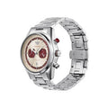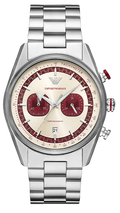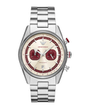 Sleek sophistication meets bold detail in this 42mm Emporio Armani timepiece. The cream sunray dial is elevated by striking red, CD-finished subdials that bring both style and function to the forefront. Powered by a precise chronograph movement, this watch offers performance with a refined edge. A polished stainless steel bracelet completes the look, making it the perfect accessory for those who appreciate modern luxury with a distinctive twist.