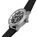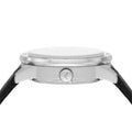 Emporio Armani's 43mm watch features a three layered dial with black Côtes de Genève and multiple finishings, automatic movement and black leather strap.