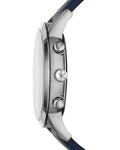 This 43mm watch features a blue dial with rose gold-tone stick indexes, chronograph movement and blue leather strap.