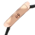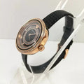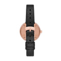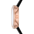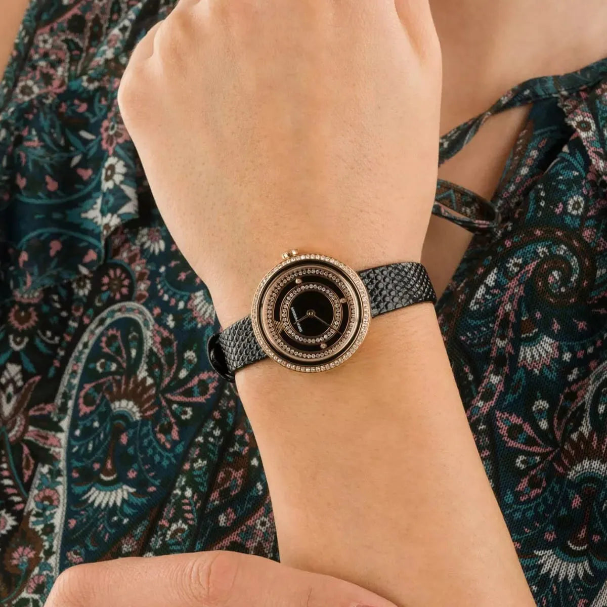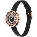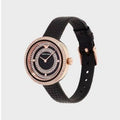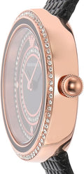• This model exhibits a black dial with concentric circles of crystals and rose gold hour and minute hands.