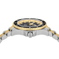 The Emporio Armani Sea Explorer AR60089 is a striking timepiece with a bold round face and a contrasting bezel that draws attention. The watch features a 42 mm diameter, making a strong statement on the wrist. Its black dial is adorned with prominent hour markers and hands, offering clear readability. The case, in a captivating gold hue, pairs seamlessly with the dual-tone bracelet, which combines gold and silver links for a unique look. The bracelet's alternating links add visual interest and character, while the fold-over clasp ensures a secure fit.