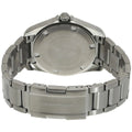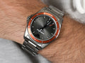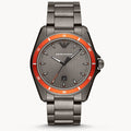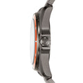 This 44mm watch features a gray dial with white stick indexes, orange topring, three-hand movement and gunmetal stainless steel bracelet.