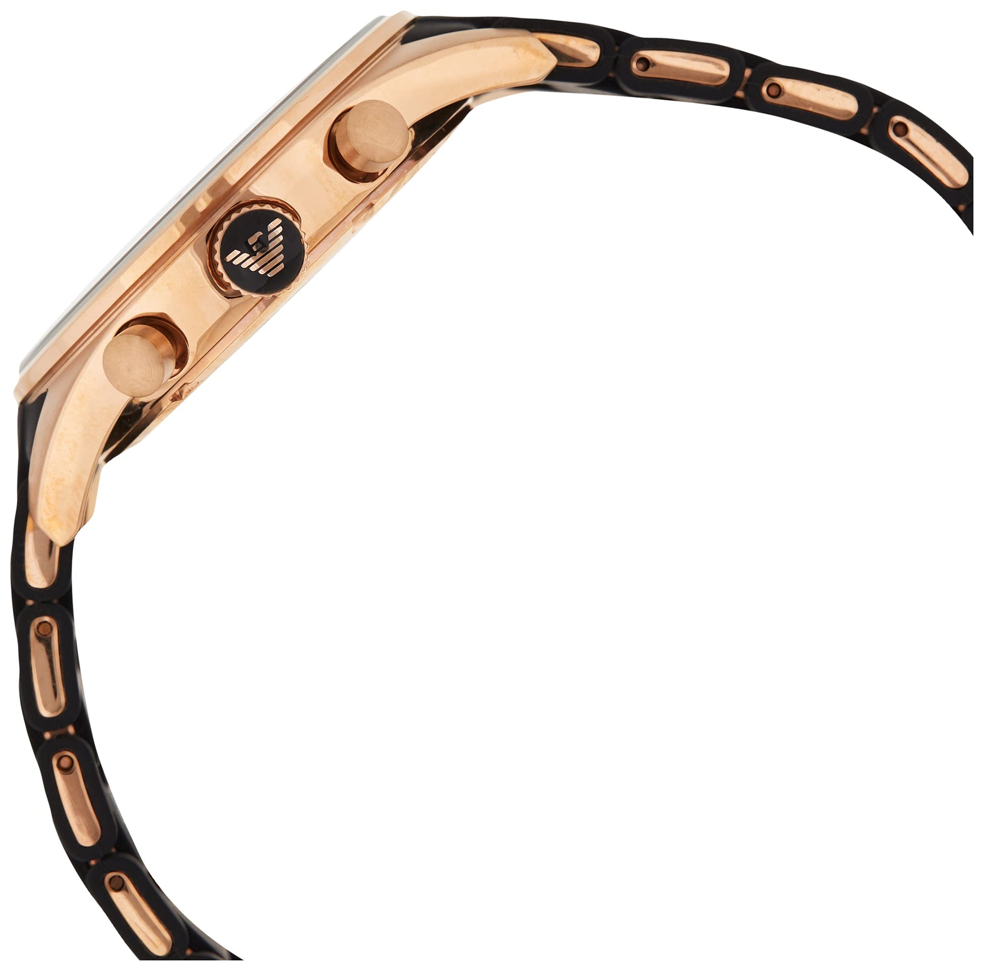 A decadent gold-toned timepiece with a comfortable, sporty fit, the Men’s Black and Rose Gold Silicone Chronograph Emporio Armani Watch AR5905 is a dream to wear. This lovely watch begins with a round 38mm gold-toned stainless steel case with a fixed gold-toned bezel and a textured crown with black cabochon and two pushers. These elements surround a bold black dial, which is protected by a mineral crystal and features Arabic numeral minute markers and luminous gold-toned hands powered by precise quartz movement. The dial also features three chronograph subdials offering 60-second, 60-minute and 24-hour displays with a date display window between the 4 and 5 ‘o’clock positions. A black rubber link bracelet straps this watch to the wrist, while a gold-toned deployment clasp ensures its secure placement. Finally, this watch boasts water resistance up to 165 feet (50 meters).
