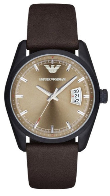 The Mens Emporio Armani Watch AR6081 (AR6081) is available to buy from Shade Station. It features a brown leather strap, a carbon coated stainless steel case and has a brown sunray with three hand movement and date window dial. The AR6081 comes with an official Emporio Armani Watches 2 year guarantee.