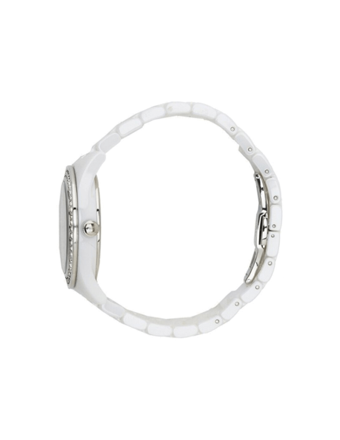 Ladies Emporio Armani AR1426 watch made from white ceramic. Featuring a stunning round bezel set with sparkling clear stones and a chic mother of pearl dial. The dial also includes date function, a clear Emporio Armani logo at 12 o'clock and silver combination hour markers. The watch fastens with a push-button deployment on a slim ceramic bracelet and is powered by a quality quartz movement.