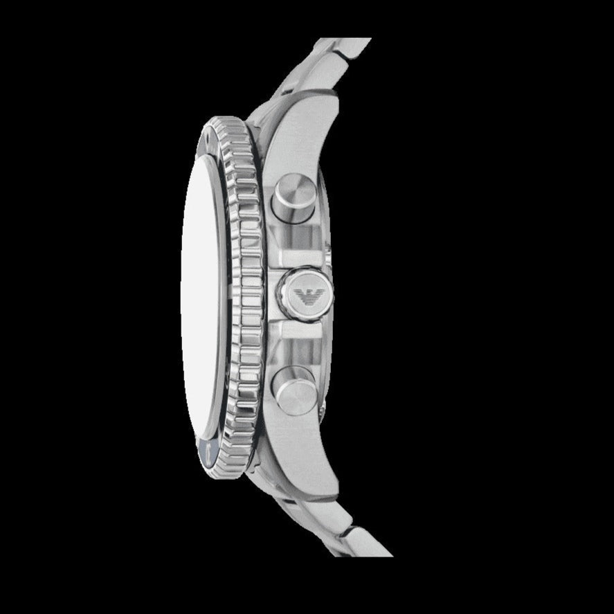 The Emporio Armani World Explorer AR11681 men's watch blends refined stainless steel craftsmanship with innovative solar-powered movement, offering both elegance and sustainability. Its bold 43.5mm case frames a striking blue sunray dial enhanced by chronograph functions and luminous accents, designed for precision and clarity.