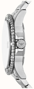 The Emporio Armani World Explorer AR11683 is a diver-style watch that combines functionality with a sleek design. Featuring a 42 mm diameter, it makes a bold statement on the wrist. The watch showcases a round case with a smooth bezel that frames a sophisticated grey dial. Clear markers and a date window on the right side offer practicality and easy readability. The watch is equipped with a quartz movement, ensuring precise timekeeping. With a water resistance of 10 ATM, it's suitable for swimming, making it a versatile choice for various activities.