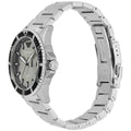 The design is complemented by a silver stainless steel case and strap, providing a cohesive and stylish look. The black bezel adds a striking contrast, enhancing the overall aesthetic. The bracelet, composed of linked segments, ensures a comfortable fit, while the fold-over clasp secures the watch firmly on the wrist. Mineral glass covers the dial, offering reliable protection without compromising clarity. This watch is a perfect blend of design and functionality, ideal for those who appreciate both style and practicality in their timepieces.