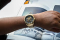 This 48mm Bronson features a black satin dial, automatic movement and gold-tone stainless steel bracelet.