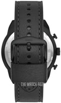 Fossil men's 50mm watch, black leather strap, black dial with chronometer, grey indicators and hands, mineral crystal and 5ATM water resistance.