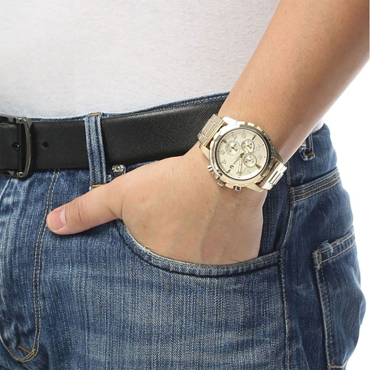 • Gold-tone stainless steel case with gold dial; gold-tone stainless steel bracelet band; links can be removed for a customized fit; interchangeable with all Fossil 22mm straps