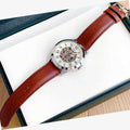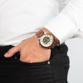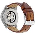 Stainless steel case with a dark brown leather strap. Fixed stainless steel bezel. Beige (skeleton center) dial with luminous silver-tone hands and Roman numeral hour markers. Arabic numeral minute markers (at 5 minute intervals). Minute markers around the outer rim. Dial Type: Analog. Luminescent hands. Automatic movement with a 40-hour power reserve. Scratch resistant mineral crystal.