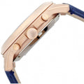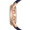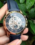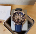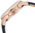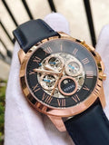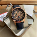 Rose gold PVD stainless steel case with a black navy leather strap. Fixed rose gold PVD bezel. Skeleton dial with luminous rose gold-tone hands and Roman numeral hour markers. Minute markers around the outer rim. Dial Type: Analog. Luminescent hands and markers. Three sub-dials displaying: date, month and day of the week. Automatic movement.