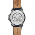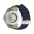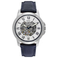 Stainless steel case with a navy blue leather strap. Fixed stainless steel bezel. Silver skeleton dial with luminous blue hands and Roman numeral hour markers. Minute markers around the outer rim. Dial Type: Analog. Automatic movement. Scratch resistant mineral crystal. Pull / push crown.