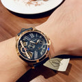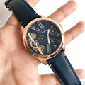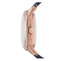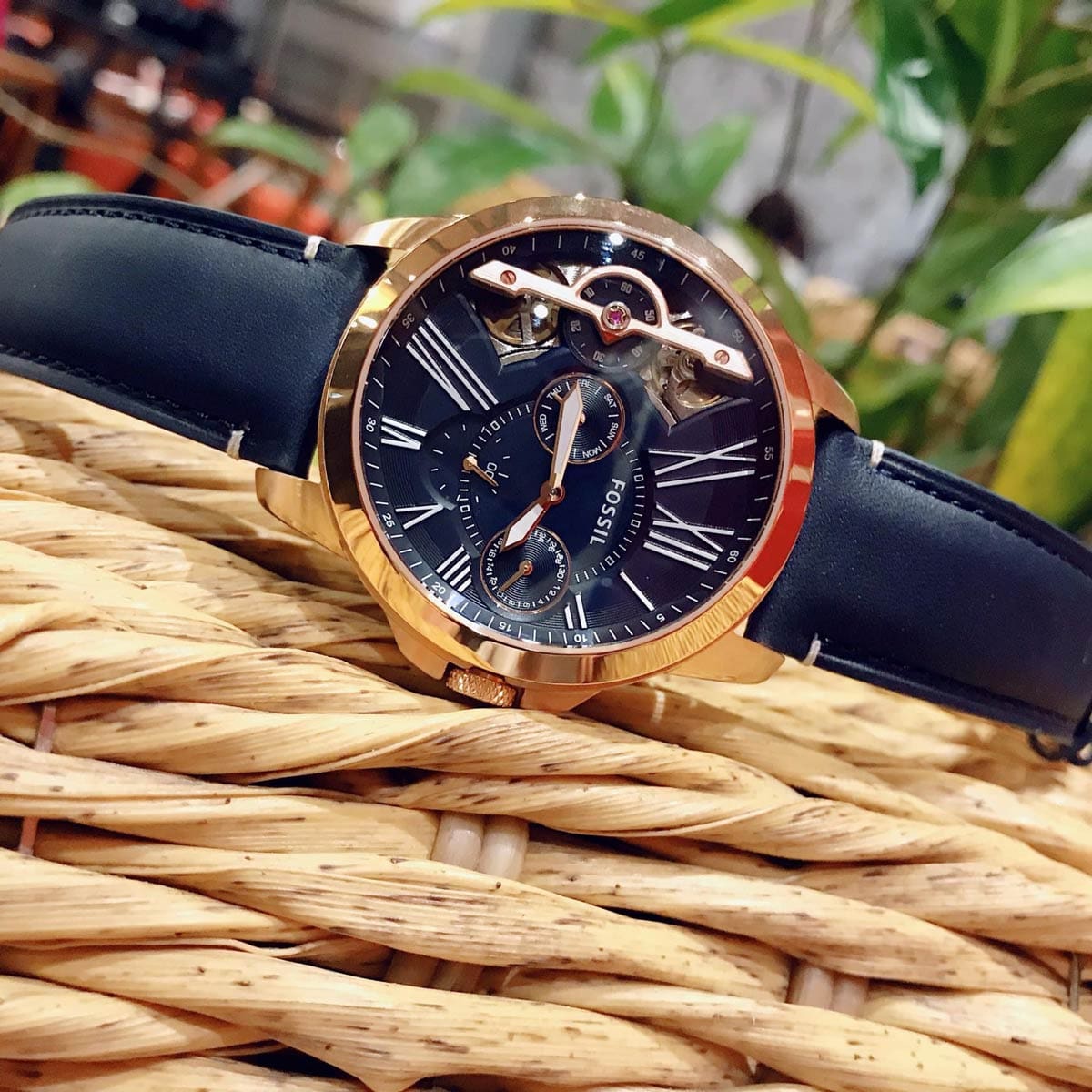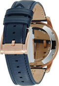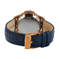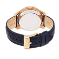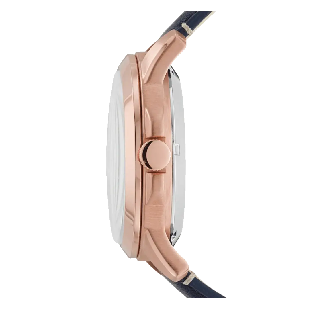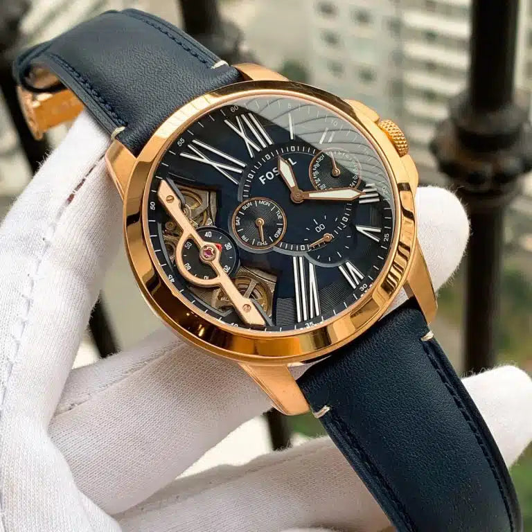 This men's analogue watch by Fossil is an absolute stunner. The simple navy blue leather strap, with buckle closure, ensures that the watch doesn't go overboard with the stunning details of the dial. Encased in a rose gold stainless steel case is a blue coloured dial with three sub-dials. The two silver hands and the Roman numerals in one half of the dial shine out against the blue of the dial.