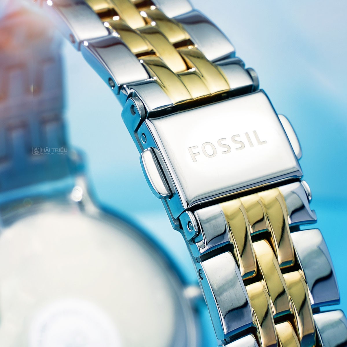 Fossil ES-5166 Jacqueline Metal Band Women Watch. The case is made out of silver stainless steel with a gold and pearl bezel, which stands for the high quality of the item, it has a white color dial.