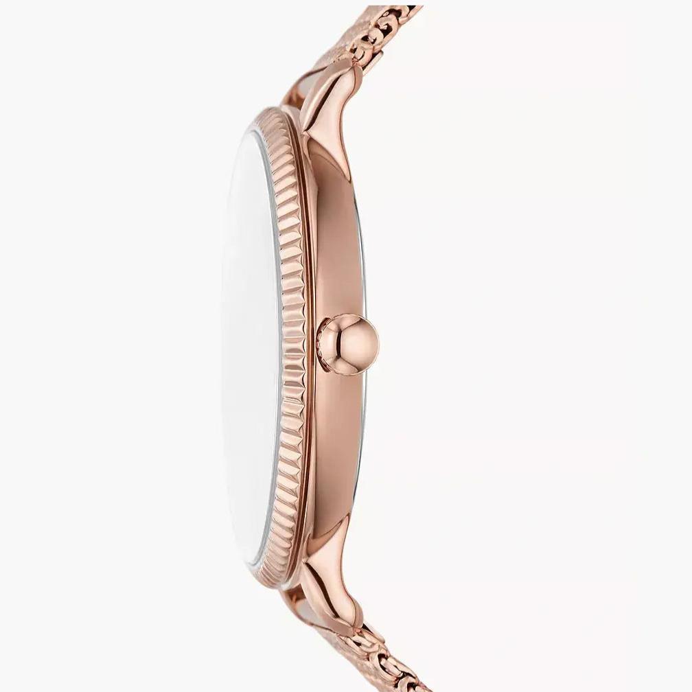 Yet another simple and classy Fossil Jacqueline watch for ladies, this one features a rose-gold mesh bracelet, rose-gold three hand, quartz movement dial, a date window and rose-gold bezel. It is encased in a stainless steel case, and the rose-gold dash markings except at 3/6/9/12hr. The material is water resistant making it highly reliable. It goes well with any formal or casual outfit.