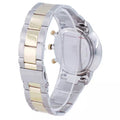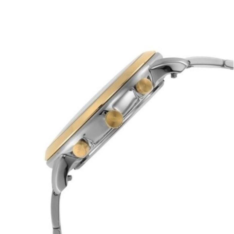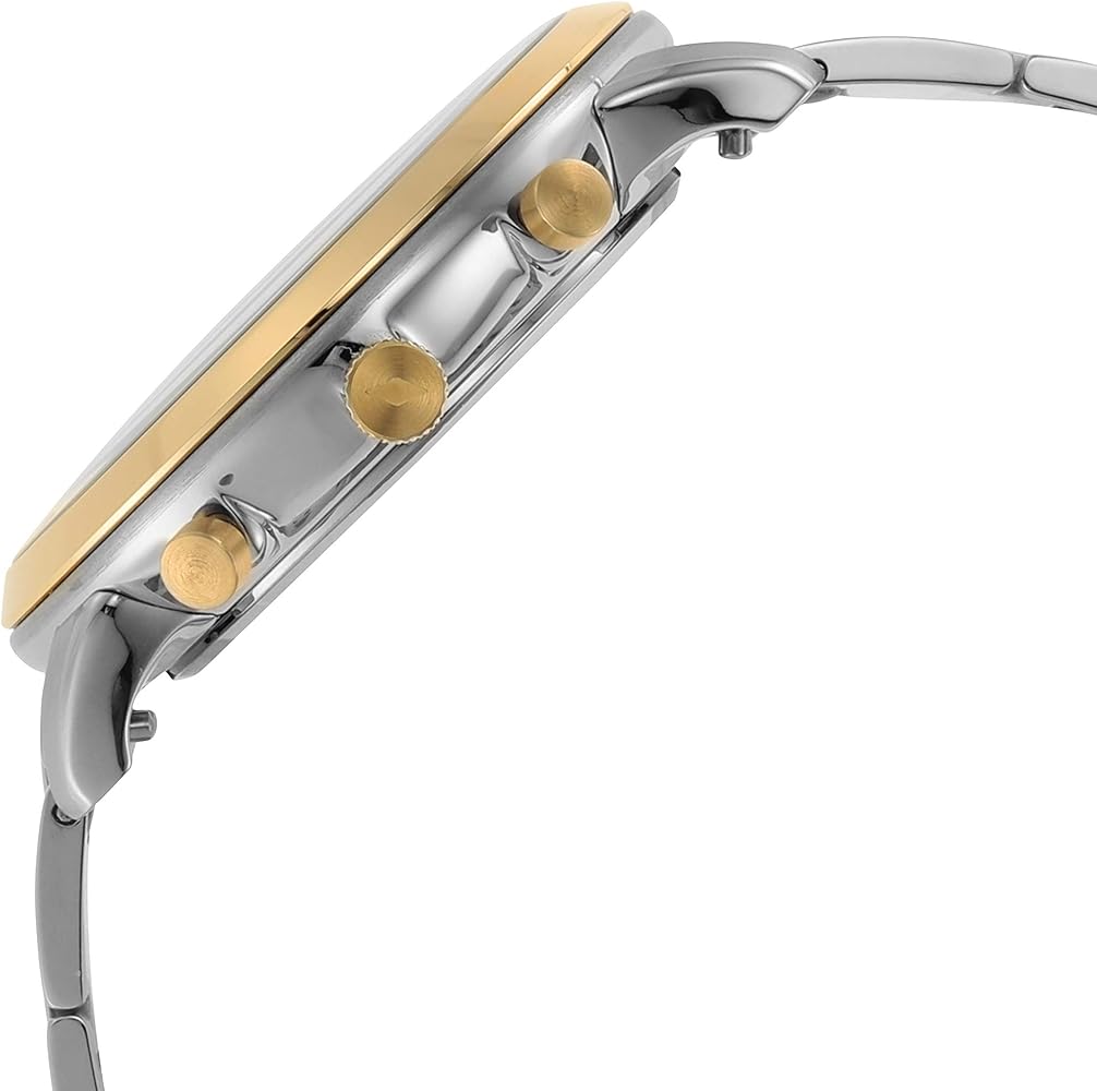 Stainless steel case with a two-tone (silver-tone and yellow gold-tone) stainless steel bracelet. Fixed yellow gold-tone bezel. Blue dial with luminous yellow gold-tone hands and index hour markers. Arabic numeral minute markers (at 5 minute intervals). Minute markers around the outer rim. Dial Type: Analog. Luminescent hands. Date display between 4 and 5 o'clock position.