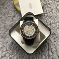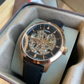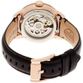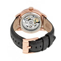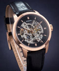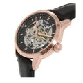 Rose gold-tone stainless steel case with a black leather strap. Fixed rose gold-tone bezel. Skeleton dial with rose gold-tone hands and index hour markers. Minute markers around the outer rim. Dial Type: Analog. Automatic movement.