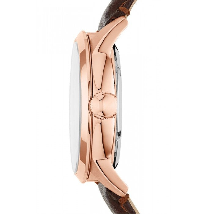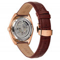 This Fossil Townsman Automatic Beige Skeleton Dial Men's Watch ME3078 comes in rose gold-tone stainless steel case with a brown leather strap. Fixed rose gold-tone bezel. Beige skeleton dial with rose gold-tone hands and index hour markers. Minute markers around the outer rim.