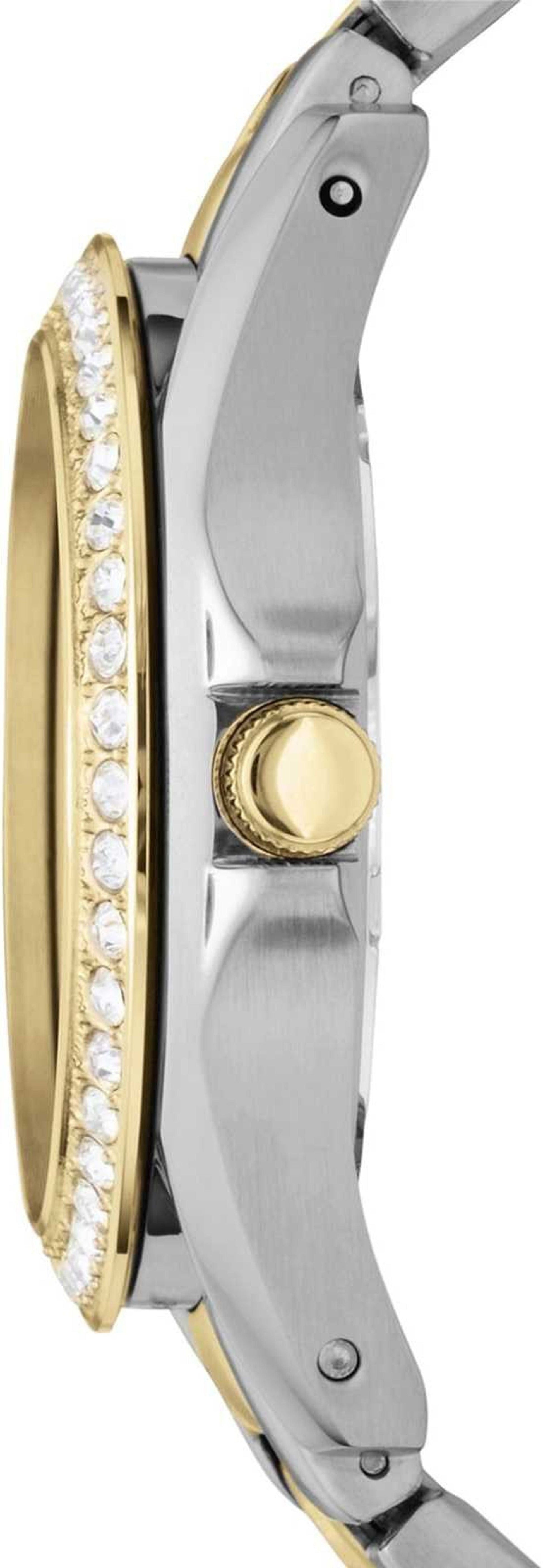 This Fossil Riley Multi-Function Two-tone Ladies Watch ES3204 comes in stainless steel case with a two-tone (silver and gold-tone) stainless steel bracelet. Fixed gold-tone bezel set with 45 crystals. Silver dial with gold-tone hands and crystal hour markers. An Arabic numeral marks the 12 o'clock position. Minute markers around the outer rim. Dial Type: Analog. Luminescent hands.