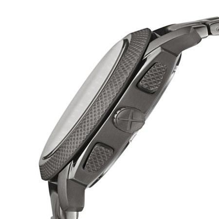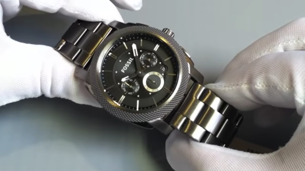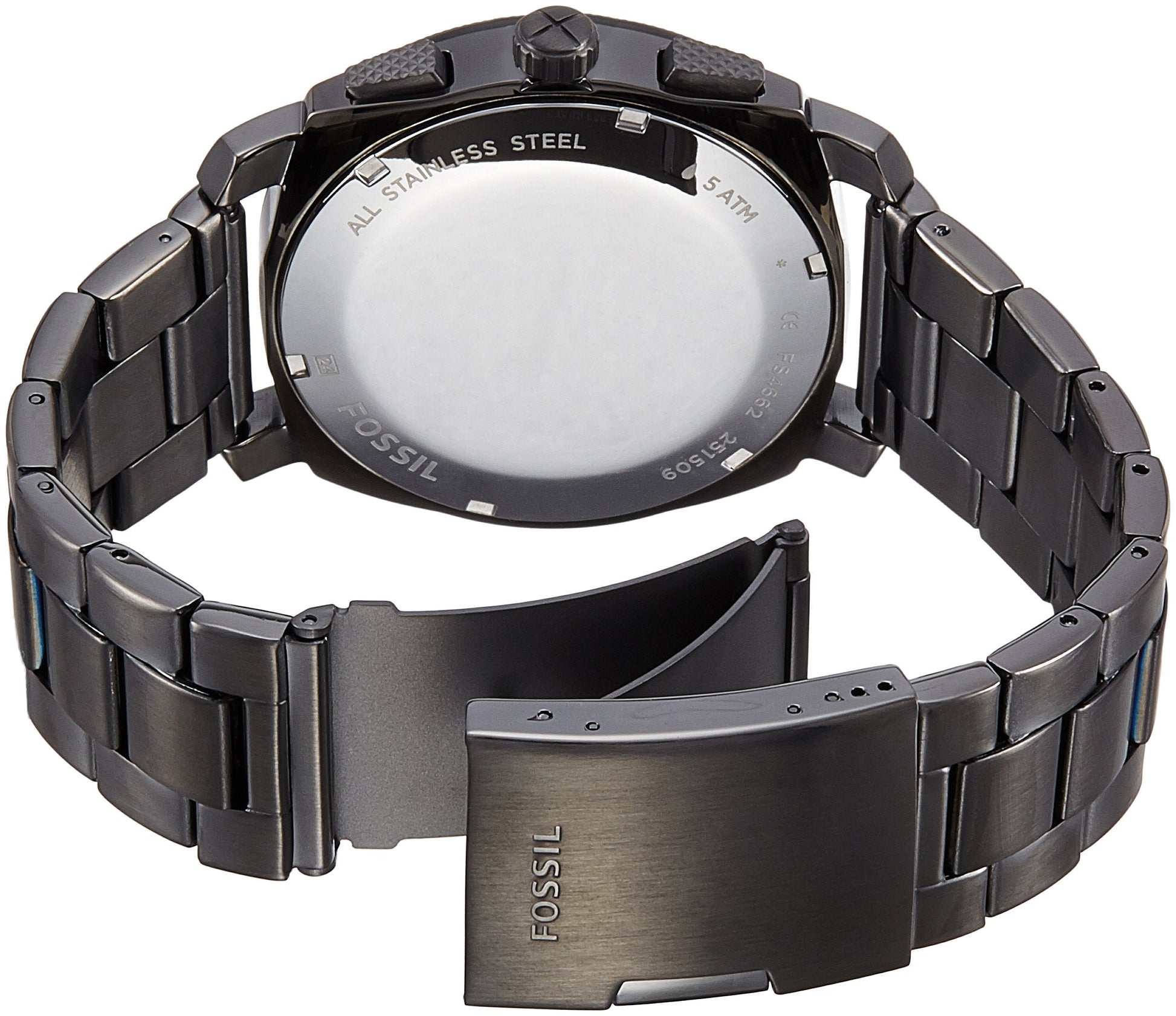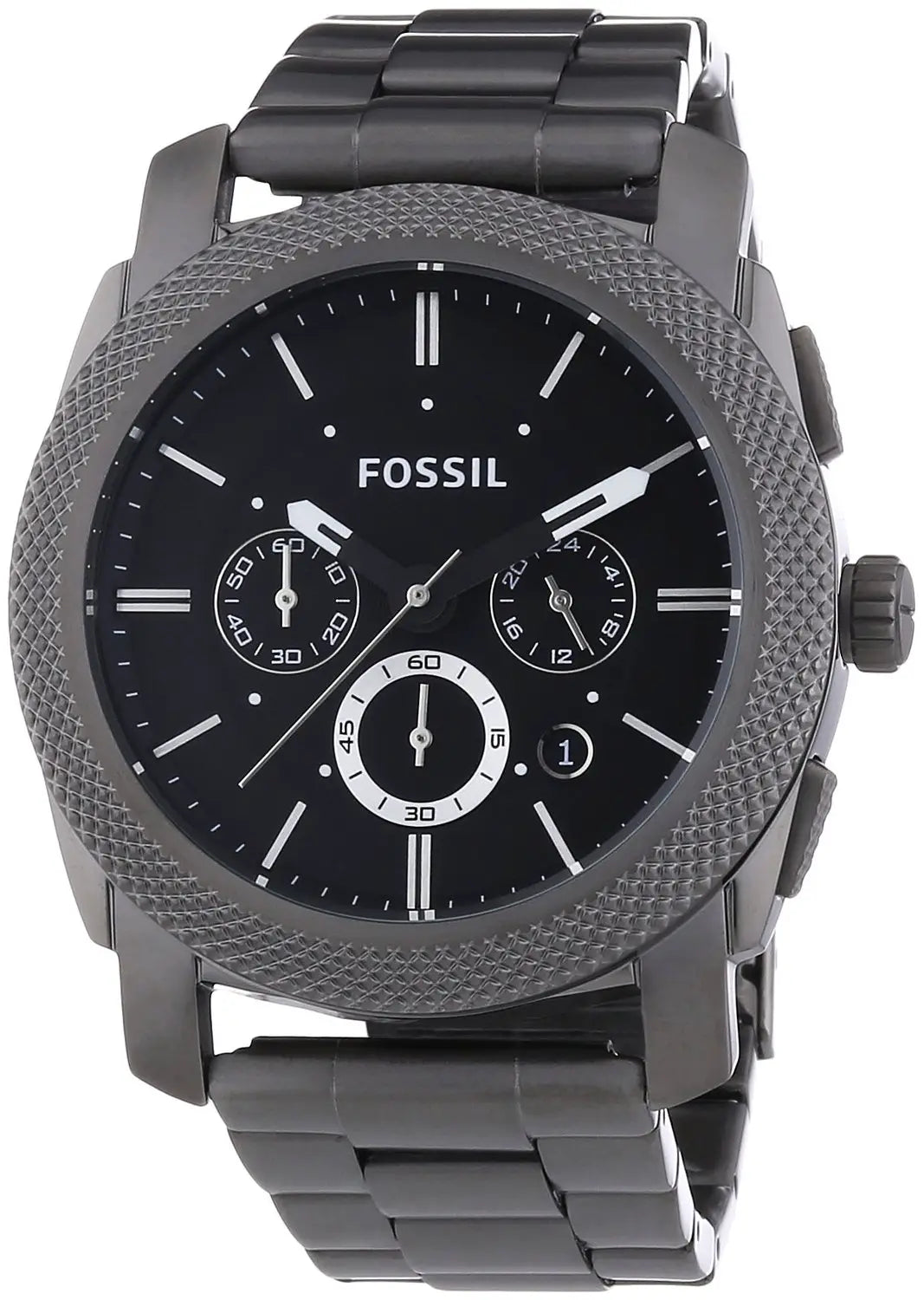 This Fossil Machine Chronograph Black Dial Men's Watch FS4662 comes in smoke ion-plated stainless steel case and bracelet. Fixed smoke ion-plated bezel. Black dial with silver-tone hands and index hour markers. Minute markers around the outer rim. Dial Type: Analog. Luminescent hands and markers. Date display between the 4 and 5 o'clock positions.