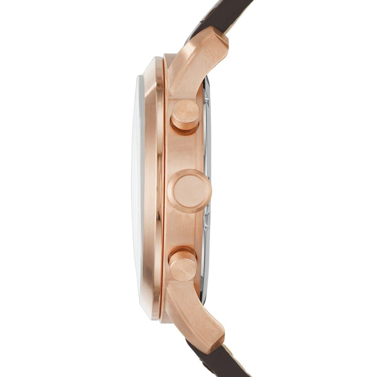 This Fossil Pilot 54 Chronograph Navy Blue Dial Men's Watch FS5204 comes in rose gold-tone stainless steel case with a dark brown leather strap. Fixed rose gold-tone bezel. Navy blue dial with rose gold-tone hands and Arabic numeral hour markers. Minute markers around the outer rim. Dial Type: Analog. Luminescent hands and markers. Chronograph - three sub-dials displaying: 60 second, 30 minute and 24 hours. Quartz movement. Scratch resistant mineral crystal. Pull / push crown. Solid case back. Case size: 44 mm. Case thickness: 12 mm. Round case shape. Band width: 22 mm. Tang clasp. Water resistant at 50 meters / 165 feet. Functions: chronograph, hour, minute, second. Sport watch style.
