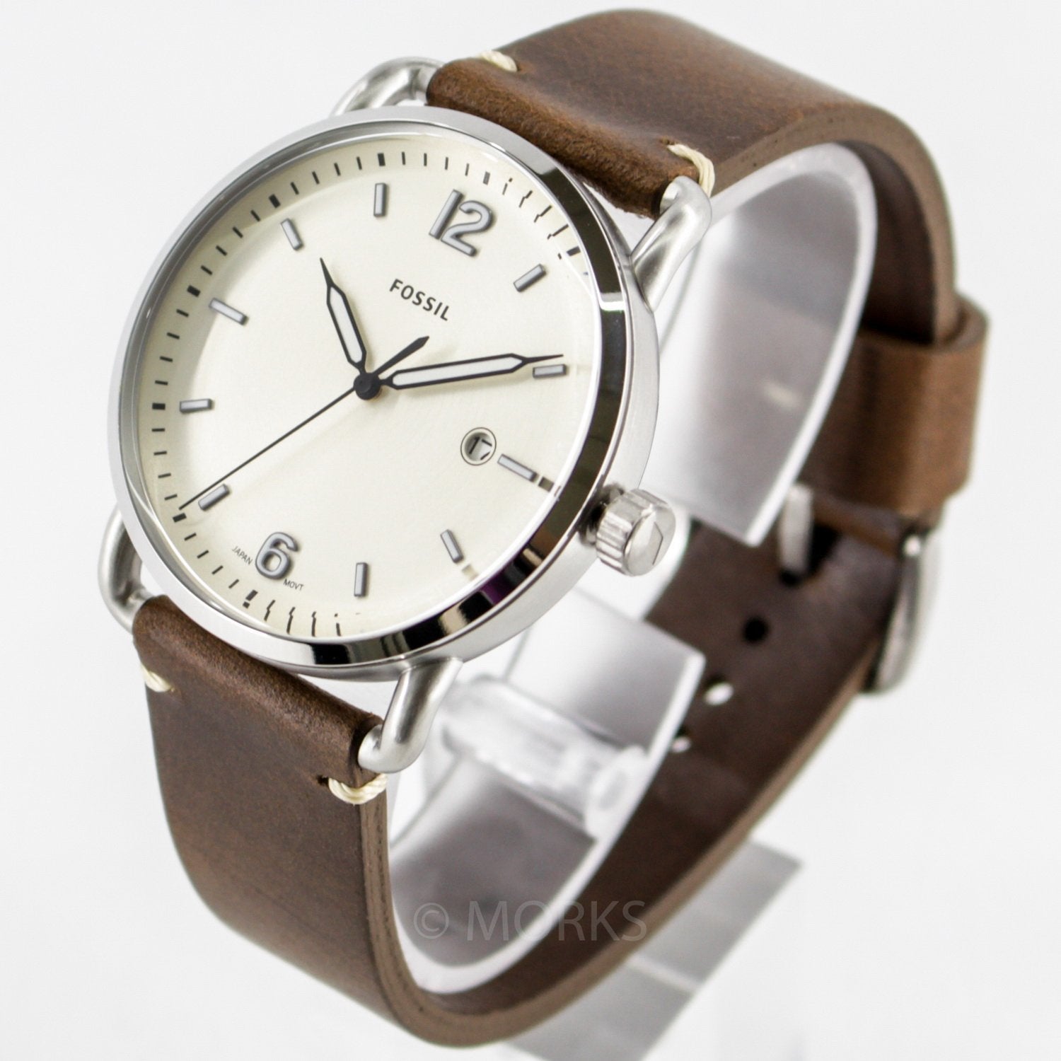 Fossil The Commuter Gent’s Watch is a Silver-tone stainless steel case with a brown leather strap. Fixed silver-tone stainless steel bezel. Cream dial with luminous black hands and index hour markers. Arabic numerals mark the 6 and 12 o’clock positions. minute markers around the outer rim.