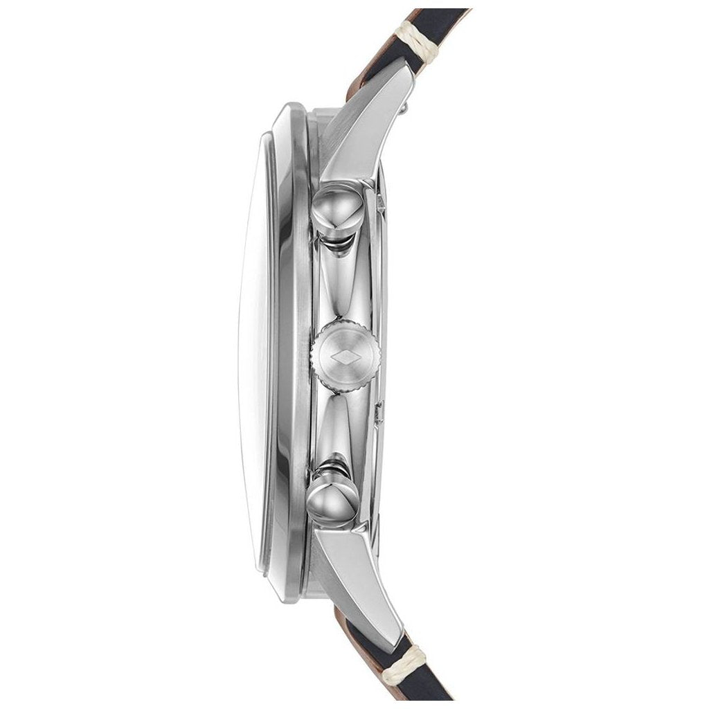 Quartz movement. Scratch resistant mineral crystal. Pull / push crown. Solid case back. Case size: 44 mm. Case thickness: 12 mm. Round case shape. Band width: 22 mm. Tang clasp. Water resistant at 50 meters / 165 feet. Functions: chronograph, hour, minute, second. Dress watch style. Fossil Townsman Chronograph Black Dial Men’s Watch FS5280.