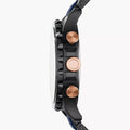 This Fossil Nate Chronograph Blue Dial Men's Watch JR1494 comes in black ion-plated stainless steel case with a black ion-plated stainless steel bracelet with blue silicone center links. Uni-directional rotating black ion-plated bezel. Blue dial with luminous hands and index hour markers. Arabic numerals mark the 3, 6, 9 and 12 o'clock positions. Minute markers around the outer rim. Dial Type: Analog. Luminescent hands. Date display between the 4 and 5 o'clock positions.