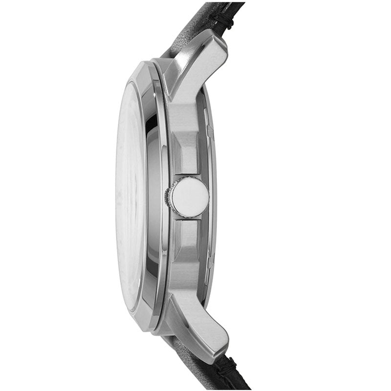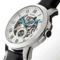 Stainless steel case with a black leather strap. Fixed stainless steel bezel. Silver skeleton dial with luminous blue hands and Roman numeral hour markers. Minute markers around the outer rim. Dial Type: Analog. Seconds sub-dial above the 6 o'clock position. Automatic movement. Scratch resistant mineral crystal.