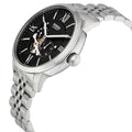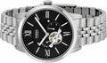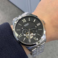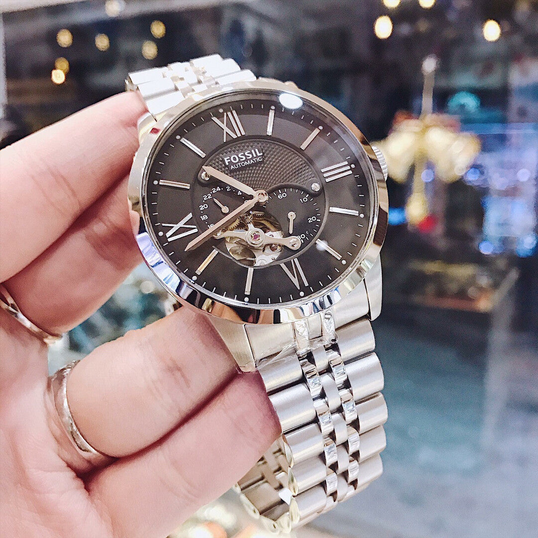 This Fossil Townsman Black Dial Men's Automatic Watch ME3107 comes in stainless steel case with a stainless steel bracelet. Fixed stainless steel bezel. Black dial with a skeletal window with silver-tone hands and index hour markers. Roman numerals mark the 3, 6, 9 and 12 o'clock positions. Minute markers around the outer rim. Dial Type: Analog. Two sub-dials displaying: 60 seconds, and 24 hours.